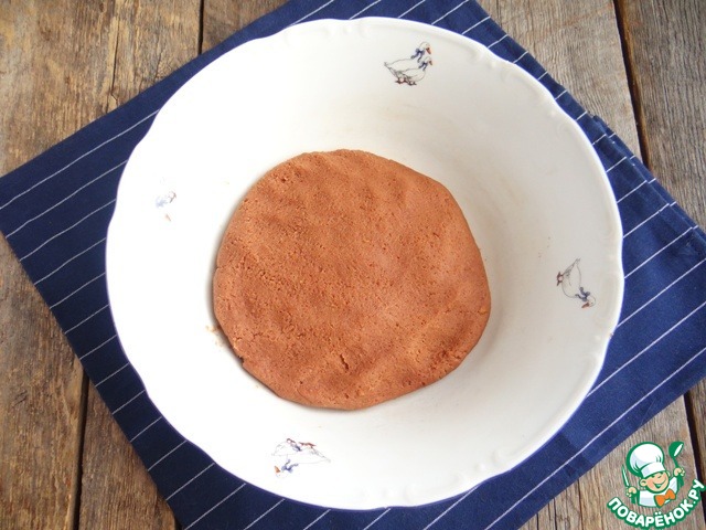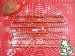 Достаю из холодильника шоколадное тесто. Стол посыпаю мукой, тесто делю на равные части - 25-30 г. Раскатываю из теста жгутики длиной, равной длине формы.