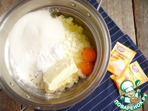 Добавляю желток, сахар и сливочное масло комнатной температуры.