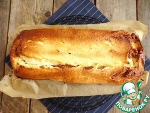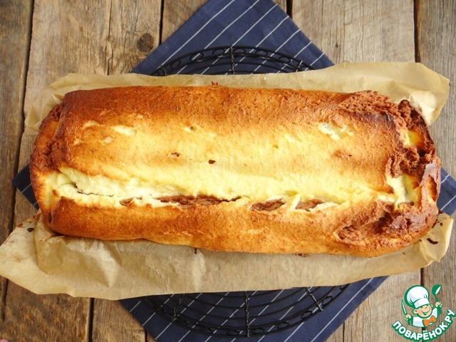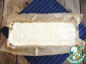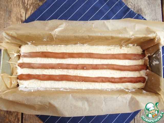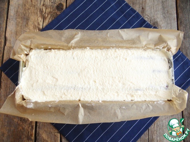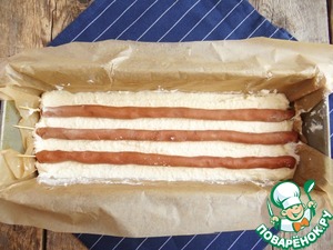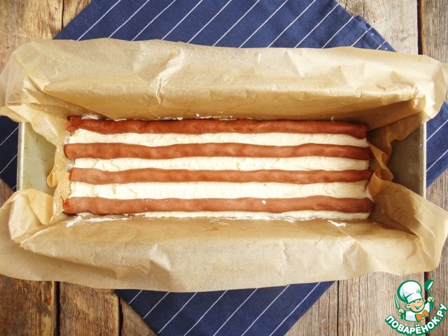 Для выпечки творожника я использовала форму для кекса размером 11*30 см. Высота формы - 7,5 см. Лучше использовать форму большего размера, чтобы творожник получался ниже моего, тогда шоколадные жгутики не будут прижиматься и останутся более круглыми. Форму застилаю пергаментом, смазываю растительным маслом. Выкладываю в форму одну часть творожной массы (я отмеряла по 300 г), равномерно распределяю ее на дне формы. Выкладываю на творожную массу шоколадные жгутики.