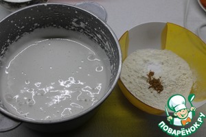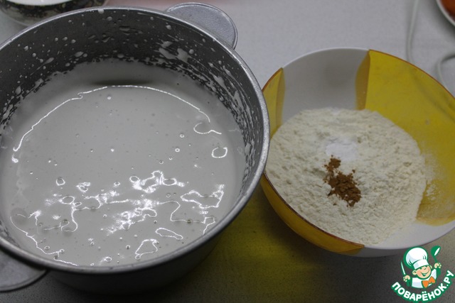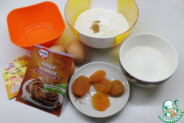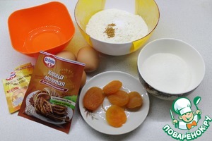 Приготовление торта начнем с бисквита. Курагу помыть и дать обсохнуть. К муке добавить корицу и разрыхлитель.