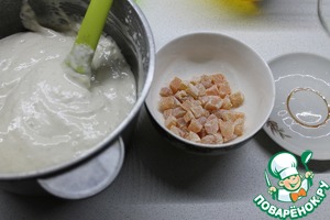 Яйца очень хорошо взбить с сахаром и щепоткой соли. Они должны в несколько раз увеличиться в объеме, побелеть и стать гладкими и достаточно плотными. Всыпать к ним просеянную муку и тщательно перемешать лопаткой.