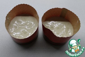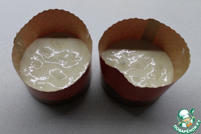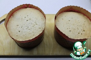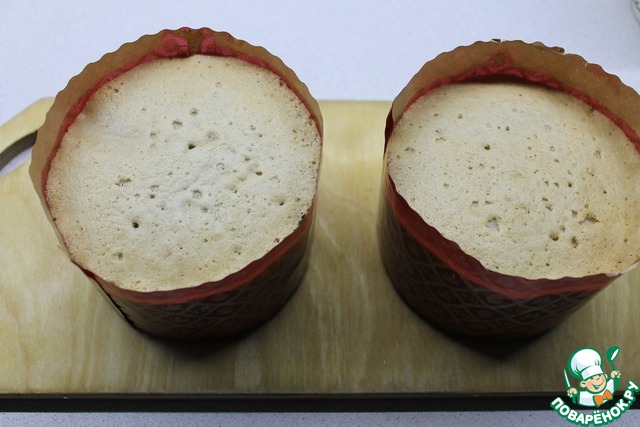 Разделить тесто на две формы для кулича (у меня их диаметр 10 см). Поставить в разогретую до 170 градусов духовку и выпекать до готовности. Первые 20 минут духовку не открывать. Готовность проверить сухой деревянной палочкой. Она должна выходить из бисквита чистой.