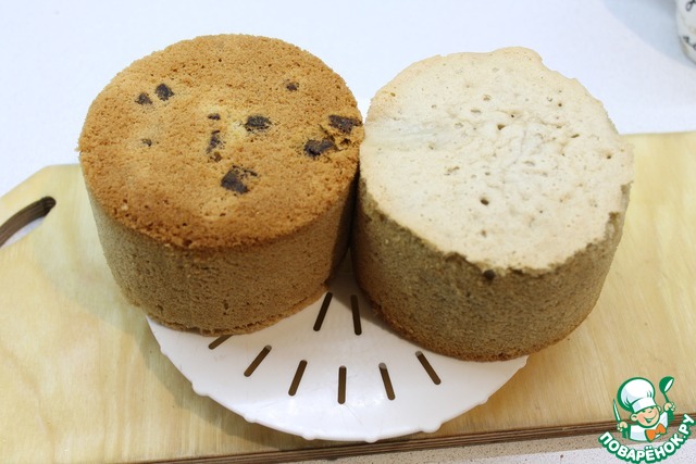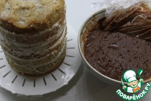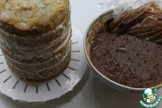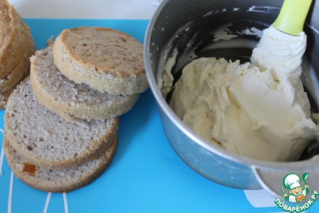 Отлежавшийся бисквит разрезать на 4 части. И собрать торт, промазывая кремом каждый слой.