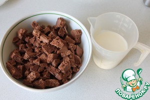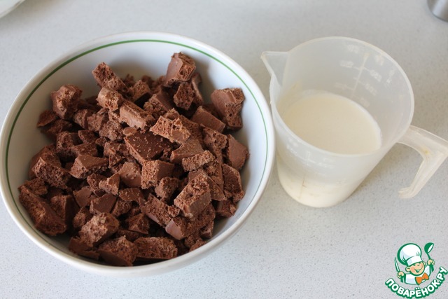 Утром нужно приготовить ганаш. Для этого шоколад поломать на небольшие кусочки. Сливки подогреть (но не кипятить!) и залить ими шоколад.