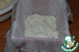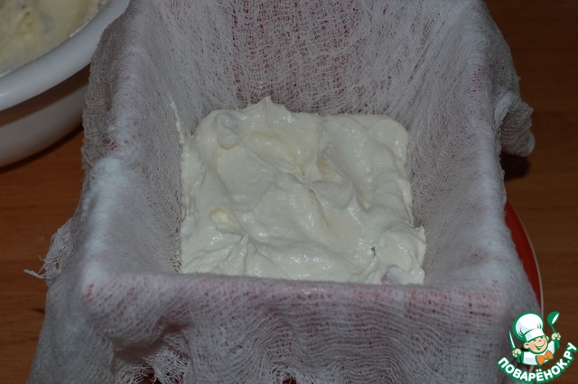 Пасочницу застелить влажной марлей, сложенной в несколько раз и наполнить творожно-сливочной массой. Накрыть краями марли, поставить гнет и отправить в холодильник на 10-12 часов.