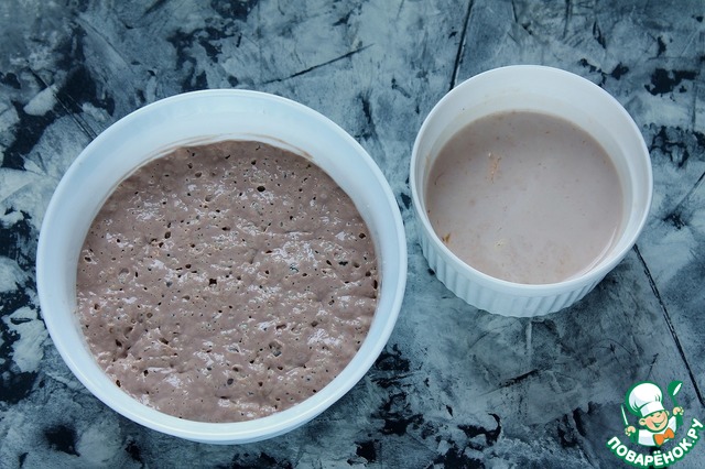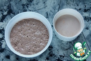 ОПАРА: в теплое молоко добавить дрожжи и муку, перемешать. Накрыть и оставить на 30-40 минут. Опара должна увеличиться в объеме.