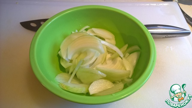 Нарезаем репчатый лук тонкими долькаим