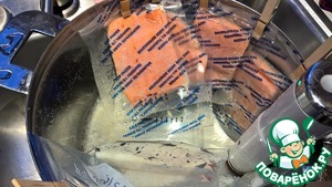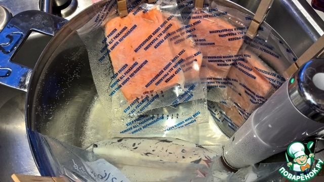 Готовим рыбу. В этот раз я делал в Су Виде, поэтому поставил ее готовиться заранее. А если будем жарить - то лучше делать в конце, когда соус и рататуй уже готовы - чтобы не остыла. В Су Виде готовим при 54°C / 130°F 45 мин замороженную или 30 мин незамороженную. Для этого разрезаем филе на порционные куски - 170 - 200 г и упаковываем в обычные зиплок пакеты для морозилки или специальные вакуумные пакеты для Су Вида, посолив, поперчив и добавив немного оливкового масла. Если используем зиплок пакеты - выдавливаем воздух, погружая пакет с рыбой в воду и удерживая горловину над водой. Когда воздух выйдет - закрываем зиплок. После приготовления - разрезаем или разламываем порционные куски на 3 - 4 части