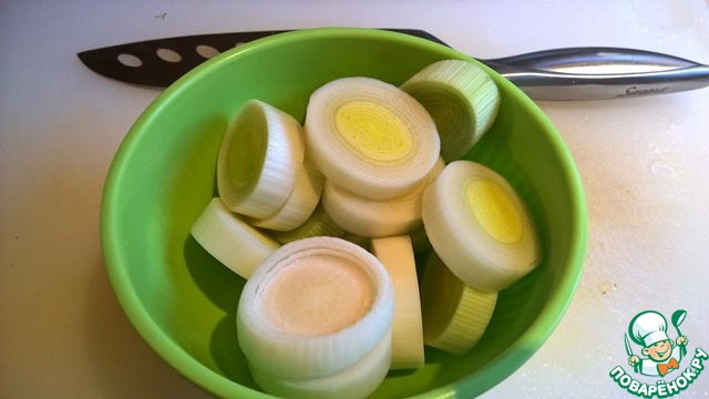 Готовим рататуй для гарнира. Сначала нарезаем лук порей кружочками, толщиной 1 см