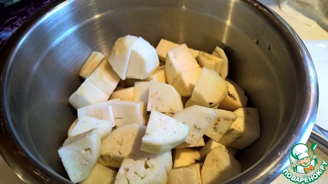 Очищаем баклажаны от кожицы и нарезаем крупными кусками - 2 - 3 см