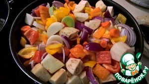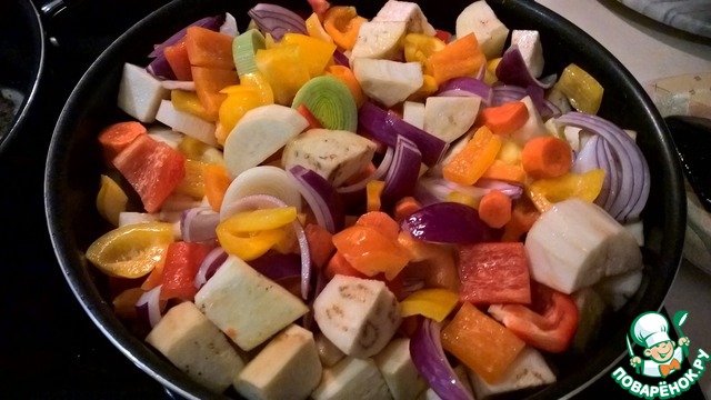 Разогреваем сковороду на сильном огне с добавлением рафинированного оливкового масла (4 ст. л.). Выкладываем овощи в разогретую сковороду и обжариваем на сильном огне - до появления румяной корочки. Затем добавляем 100 г вина, уменьшаем огонь до среднего и доводим до почти до готовности. Овощи должны быть с хрустинкой - аль денте.