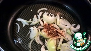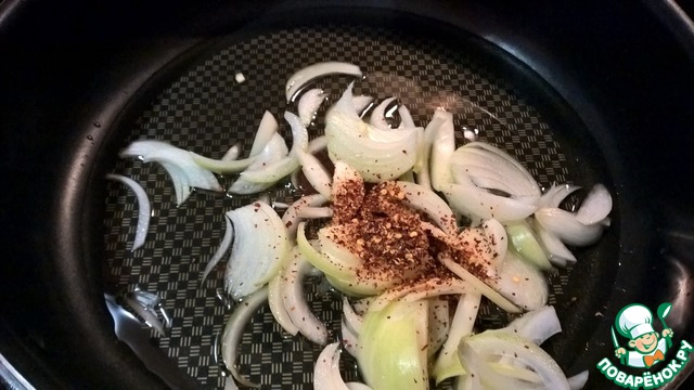Начинаем пассеровать репчатый лук со жгучим перцем на сковороде с добавлением рафинированного оливкового масла. После того, как почувствуем характерный запах жаренного лука, пассеруем еще минут 5 на среднем огне.