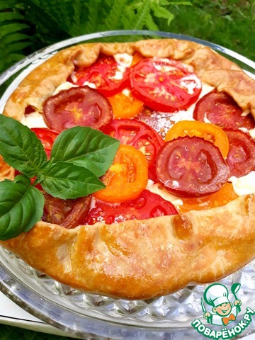 Каждый кусок теста тонко раскатываем в круг (раскатывать удобнее всего сразу на пергаменте). Выкладываем творог и кружочки помидоров. Заворачиваем края.
