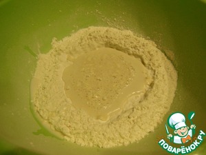 Пакетик с дрожжами был открыт, поэтому я дрожжи активировала - растворила в тёплом молоке с добавлением щепотки сахара и муки. Всё "заработало", влила дрожжи в мучную смесь.