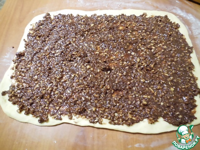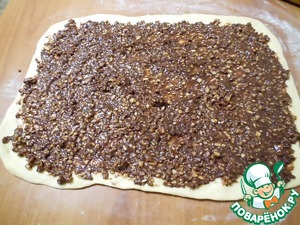 Равномерно распределить ореховую начинку и скатать руками рулет.