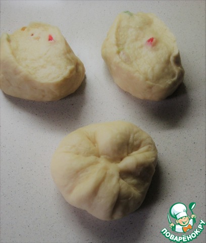 Формируем булочку, раскатывая или пальцами растягивая кусочек в круглую заготовку, затем собираем края к центру.