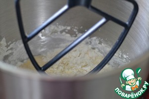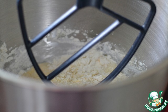 В чаше миксера лопаткой смешать оставшуюся муку, сахар, молоко, яйцо и подошедшие дрожжи.