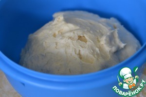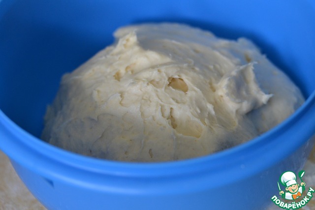 Выложить подошедшее тесто. Посыпать мукой и вымесить.