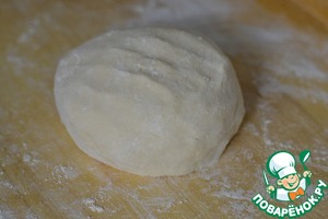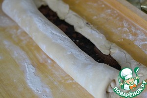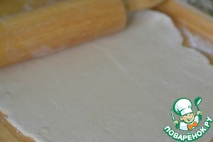 Раскатать тесто в прямоугольник, если сильно тесто липнет, то подсыпать мукой.