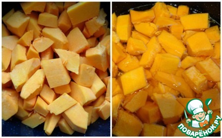 Тыкву очистить от кожуры и семечек, порезать на кусочки произвольной формы. Залит тыкву двумя литрами воды, довести до кипения и варить 20 минут. Поставить остывать до теплого состояния.