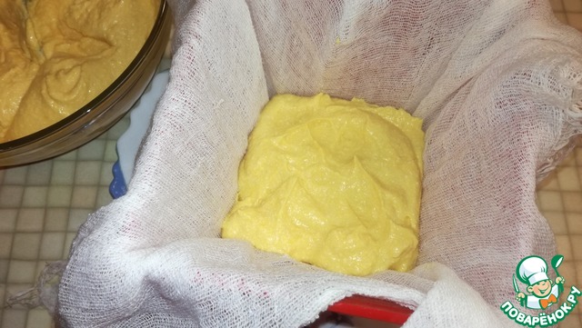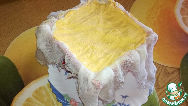 Закрываем концами марли. Ставим в глубокую тарелку. Сверху поставить груз (банку с вареньем или водой). Убираем в холодильник на 12-13 часов. Изредка сливаем образовавшуюся жидкость.
