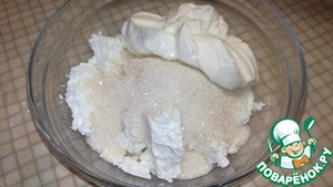 В миске хорошо взбить блендером творог, сахар и сметану.