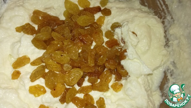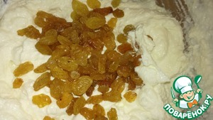 Слоями выложить наши приготовленные массы. У меня первый слой творожная с изюмом.