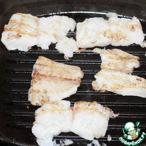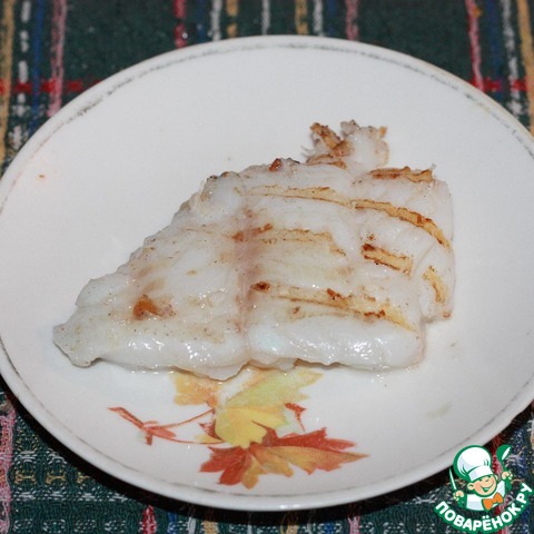 Филе разрезать на порционные куски. Их надо положить в дуршлаг не менее, чем на час, чтобы еще стекло максимум жидкости. После того, как жидкость стечет, нужно посолить и поперчить рыбу по вкусу.