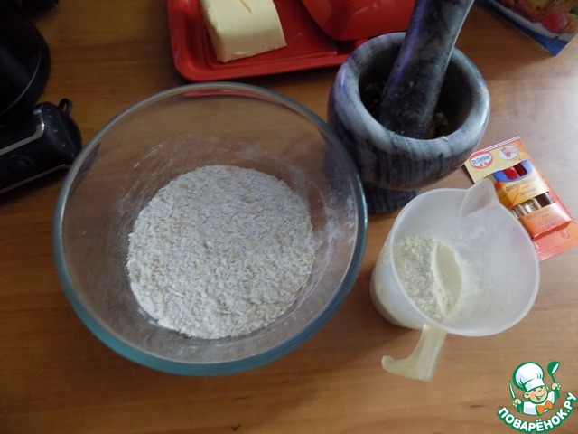 Пересыпаем смесь в посуду, где будем делать тесто для печенья. Добавляем муку пшеничную, а лучше цельнозерновую. Орехи я разбила пестиком в ступке не мелко. Их можно обжарить предварительно.