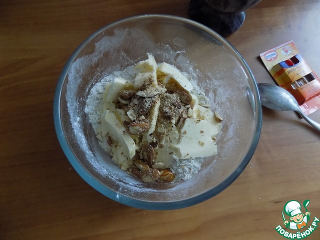 Сливочное масло нужно выложить из холодильника заранее, чтобы оно было мягкое. Режем его небольшими кусочками и выкладываем к смеси вместе с орехами и двумя каплями миндального ароматизатора Dr. Oetker.