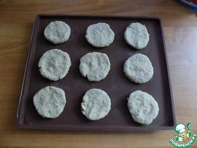 Готовим противень, застеленный пекарской бумагой. Я буду использовать силиконовый коврик. От теста отрываем кусочки, скатываем в небольшие шарики, сплюснув их в печенье. Печенек получилось 9 шт D~ 5 см и высотой-1 см. Выложила на коврик с расстоянием друг от друга. Духовку греем до т-180 С.