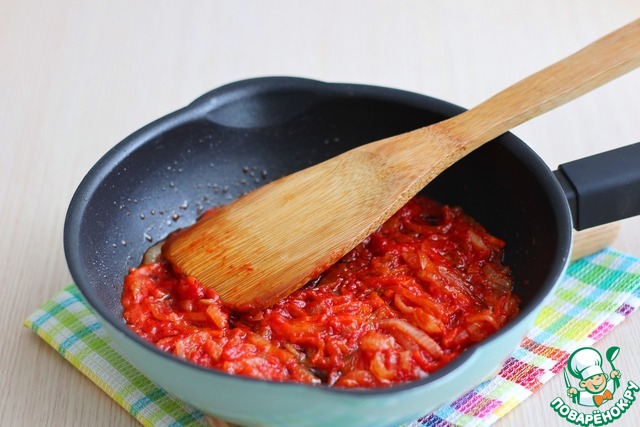 В сковороду добавить 2-3 ст. ложки растительного масла. Пассеровать лук и морковь до легкой золотистой корочки, затем добавить 1 ст. ложку томатной пасты. Смесь хорошо размешать, добавить 1-2 ст. ложки бульона.