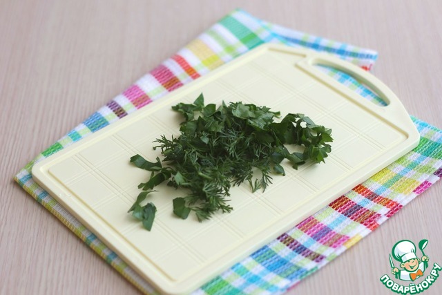 Свежую зелень нашинковать.