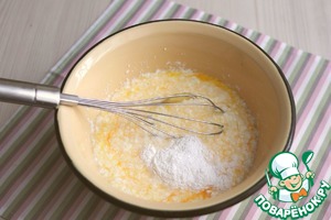 Далее добавить муку (250 гр.). Смесь взбить венчиком и можно приступить к выпеканию оладий.