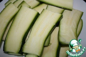 Кабачки у меня небольшие и их надо разрезать пополам, а потом каждую половинку разрезать на пластинки.