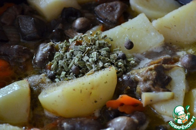 Рагу - это так удобно: первое и второе, на выбор Вашим едокам. Да и продукты можно использовать разные, всего по чуть-чуть и на столе ароматное, богатое блюдо, сытное и красивое. Я люблю каждый продукт предварительно обжарить, мне кажется так вкуснее, да и кусочки овощей не разваливаются. Предлагаю сегодня приготовить рагу с куриными сердечками, лесными грибами, сушёными мятой, сельдереем и базиликом, вкусно. Угощайтесь.