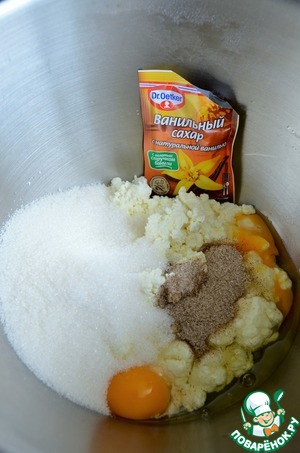 В мягкий творог добавить оба вида сахара, яйца,