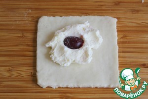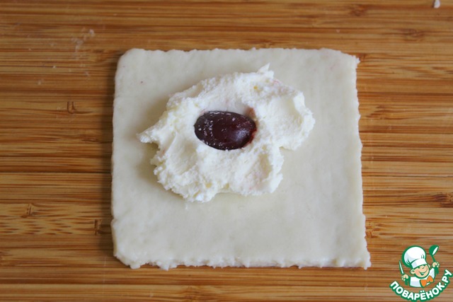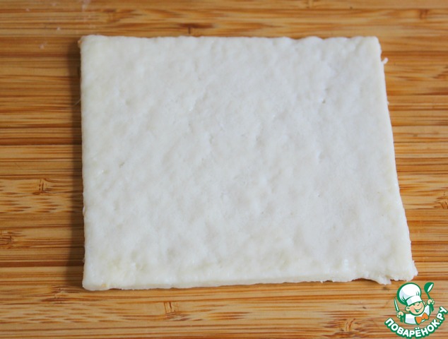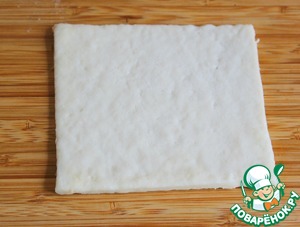 Раскатать тесто в тонкий пласт и вырезать квадраты - у меня 10х10 см.