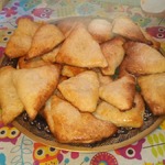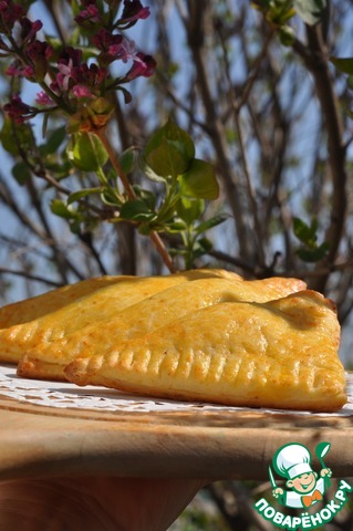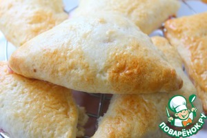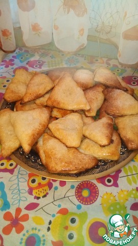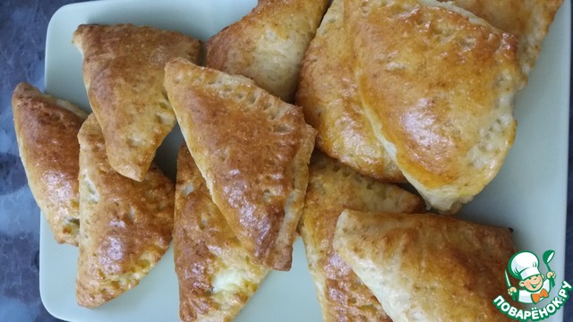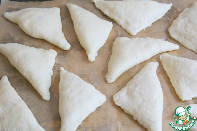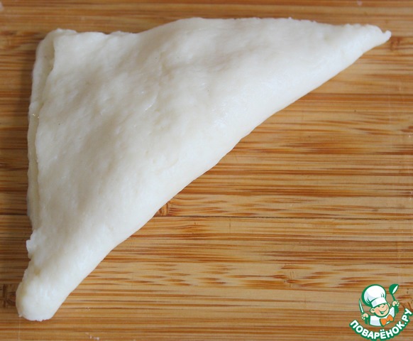 Накрыть начинку тестом. образуя треугольник. Хорошо скрепить края, чтобы при выпечке начинка не вылезла.
