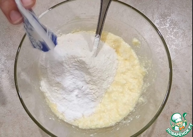 Добавьте просеянную муку и разрыхлитель. Все тщательно перемешайте.
