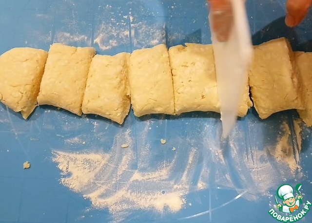Стол припылите мукой, чтобы удобно было работать с тестом. Немного вымесите и разделите на 8 ровных частей.