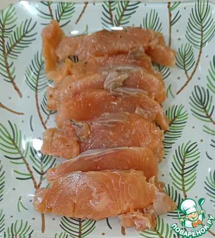 У меня уже было филе горбуши из брикетов. Поэтому кусочки разные по размеру. Но для засолки самое то