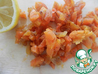 Курагу промыть, обсушить, нарезать произвольными кусочками. Залить курагу лимонным соком (2 ст. л. - 1/4 лимона). Отставить в сторону на несколько минут.