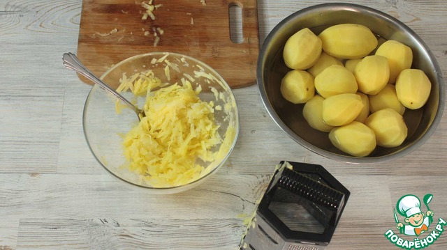 Затем натираем картофель на крупной терке. В принципе можно и нарезать небольшими кусочками или пропустить через мясорубку. Тут выбираете вариант, который Вам по душе. Каждую натертую картофелину хорошо перемешиваем с натертым луком, чтоб картофель не потемнел.