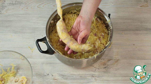 Начинаем начинять оболочку начинкой. Я использую специальную насадку от мясорубки для колбас. Можно конечно и вообще все это сделать на мясорубке, так будет быстрее. Но мне не хотелось потом ее отмывать, поэтому я делаю вручную. Так же можно взять срезанное горлышко от пластиковой бутылки (там, где узкая часть надевают оболочку а с другой стороны проталкивают начинку).