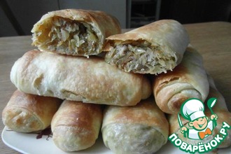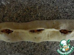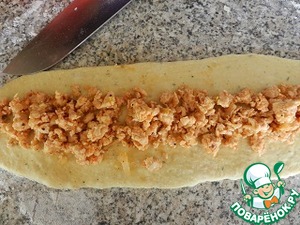 Каждую часть раскатать в длинный прямоугольник толщиной около 3мм. Выложить по длине всего прямоугольника 1/4 начинки. -