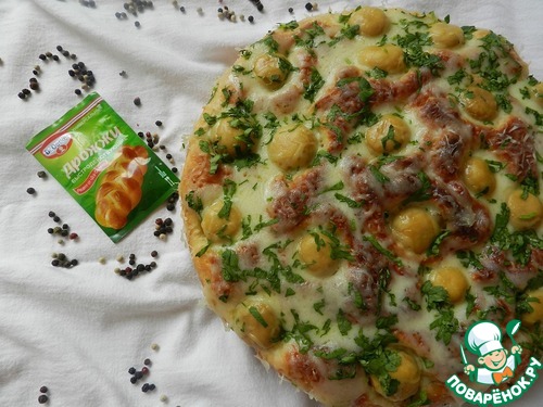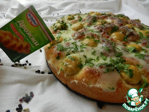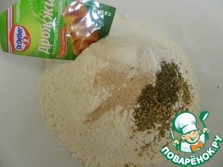 Для приготовления теста в миску выпать 450г муки, добавить 1 пакетик дрожжей (Dr.Oetker), 1ст. л. сахара, 0,5ч. л. соли, пряные травы (тимьян и орегано по 0,5ч. л.) все перемешать.