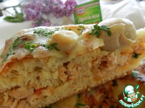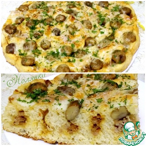 Вкусный ароматный дрожжевой пирог с мясной начинкой и сырно-грибной верхушкой.