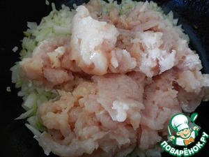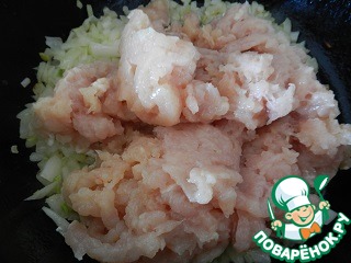 На сковороде разогреть 2ст. л. растительного масла, добавить репчатый лук, порезанный кубиками. Обжарить до мягкости в течение 2-3 минут. Добавить фарш (любой на ваш вкус, у меня из куриного филе), обжарить, помешивая в течение 3 минут. -