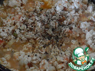 На терке натереть 1 крупный помидор. Добавить на сковороду к мясу. Через пару минут добавить 50 мл белого сухого вина или бульона (в зависимости от предпочтений), соль, смесь перцев, перемешать и жарить начинку до полного испарения жидкости. Дать начинке остыть.